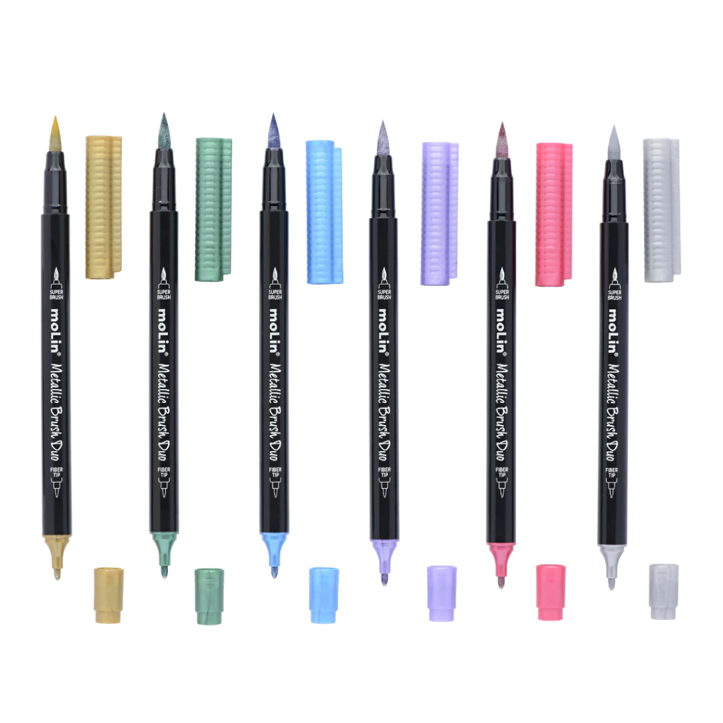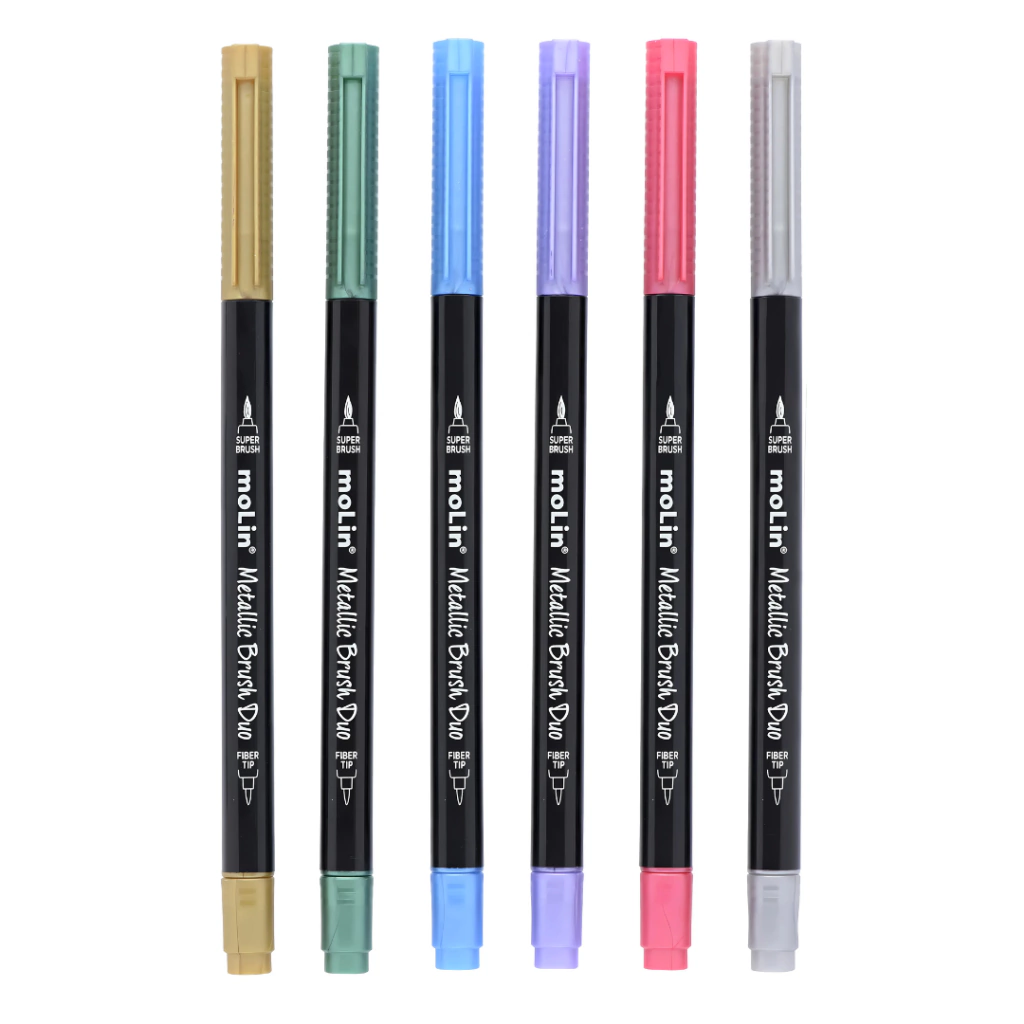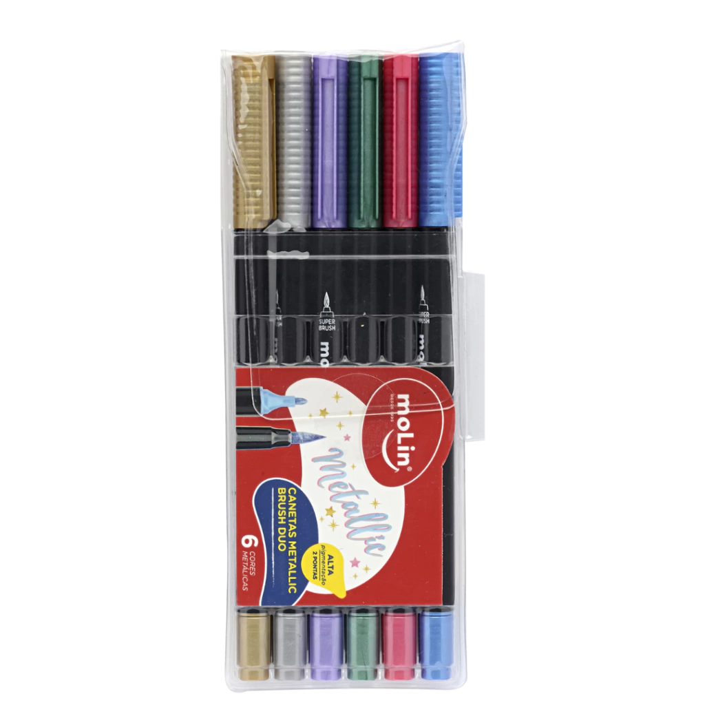 Descubra a Caneta Metallic Brush Duo 6 Cores - Molin, perfeita para dar um toque brilhante aos seus projetos! Com tinta metálica de alta pigmentação e dupla ponta — Brush 4,5mm e fina 2,5mm — você cria efeitos incríveis. Mantenha a caneta na horizontal para um acabamento metalizado impecável. Ideal para artistas e amantes do estilo único!