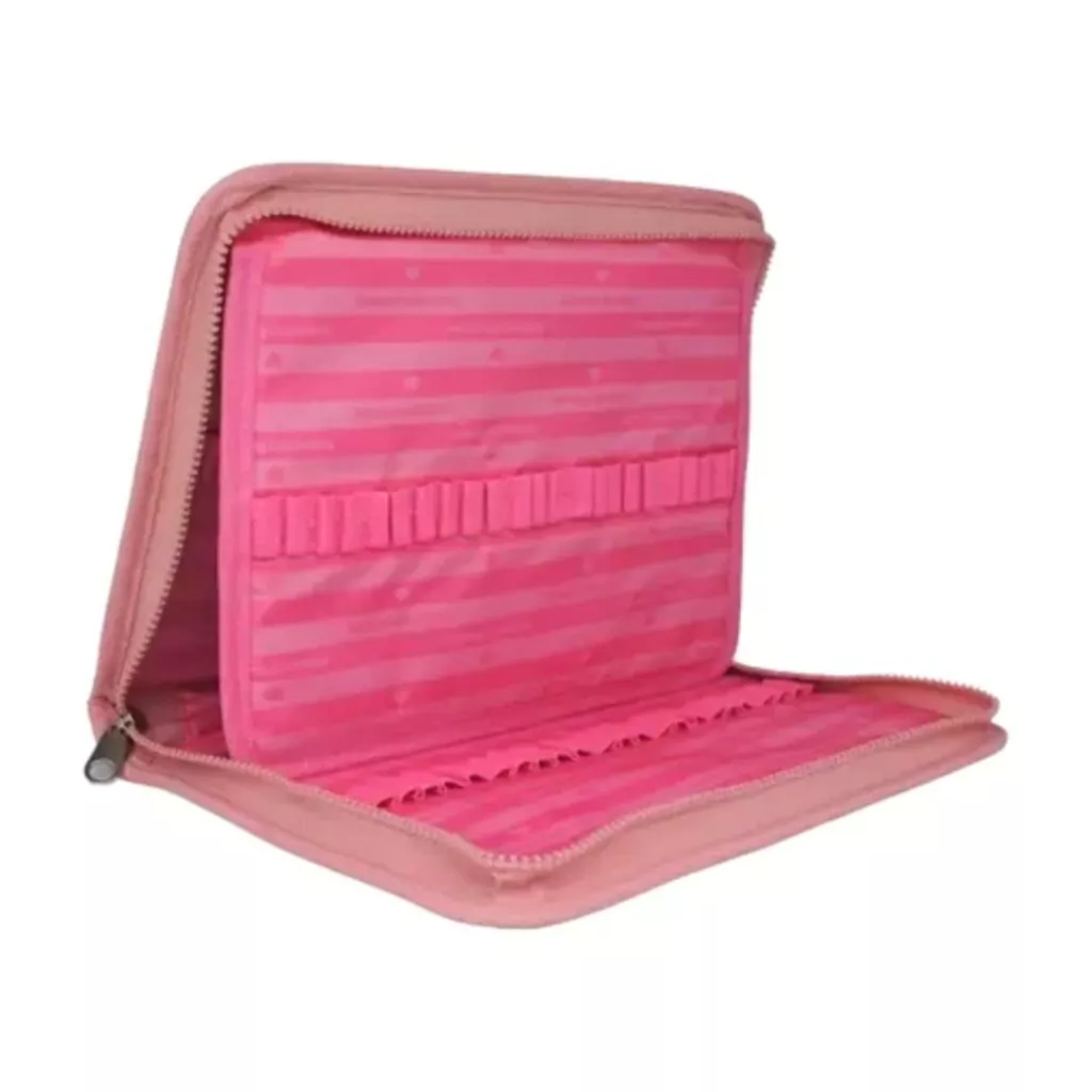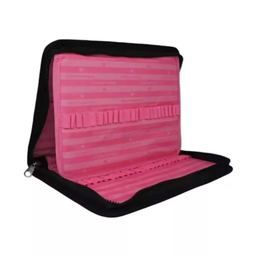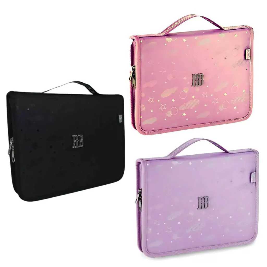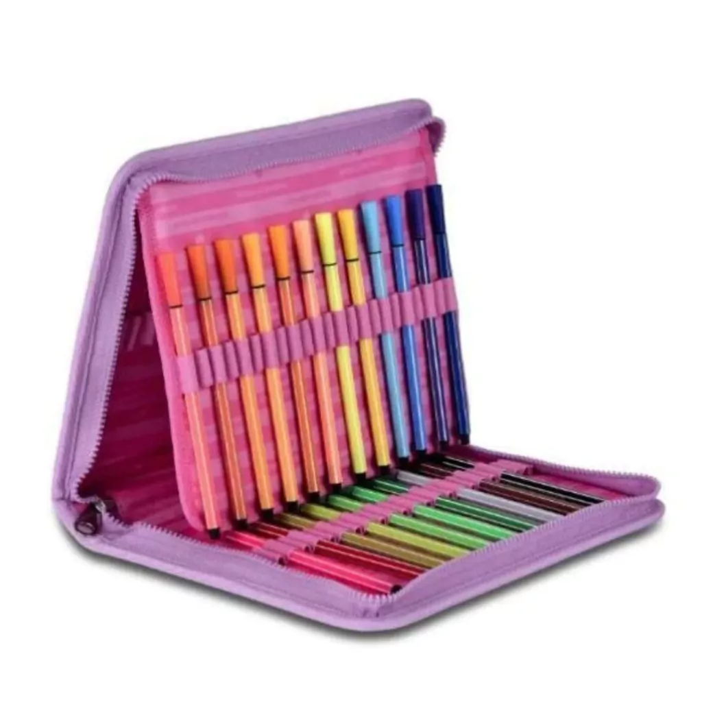 Disponível nas cores rosa, roxo, verde e preto , permite que você escolha o modelo que mais combina com seu estilo. Seu compartimento interno é dividido em três partes , com elásticos que acomodam até 96 lápis , garantindo que seus materiais fiquem sempre organizados e fáceis de usar.