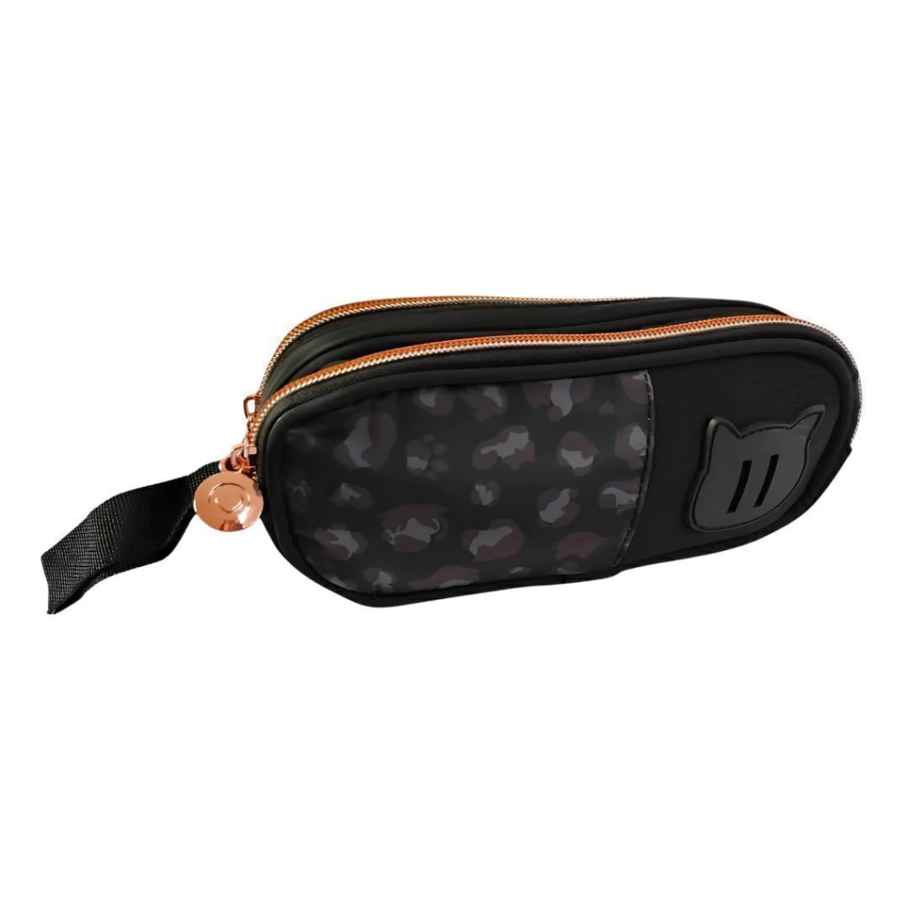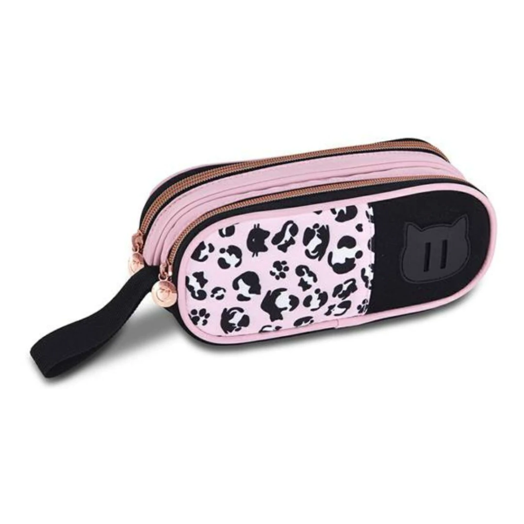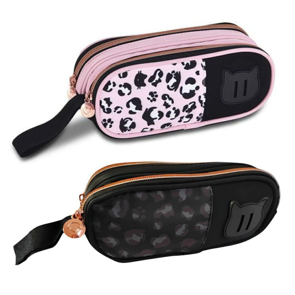 Confeccionado em nylon resistente, o estojo possui estampa de oncinha super charmosa, zíper rose gold e uma delicada etiqueta de borracha com carinha de gatinho. Ideal para levar seus materiais com organização e personalidade.