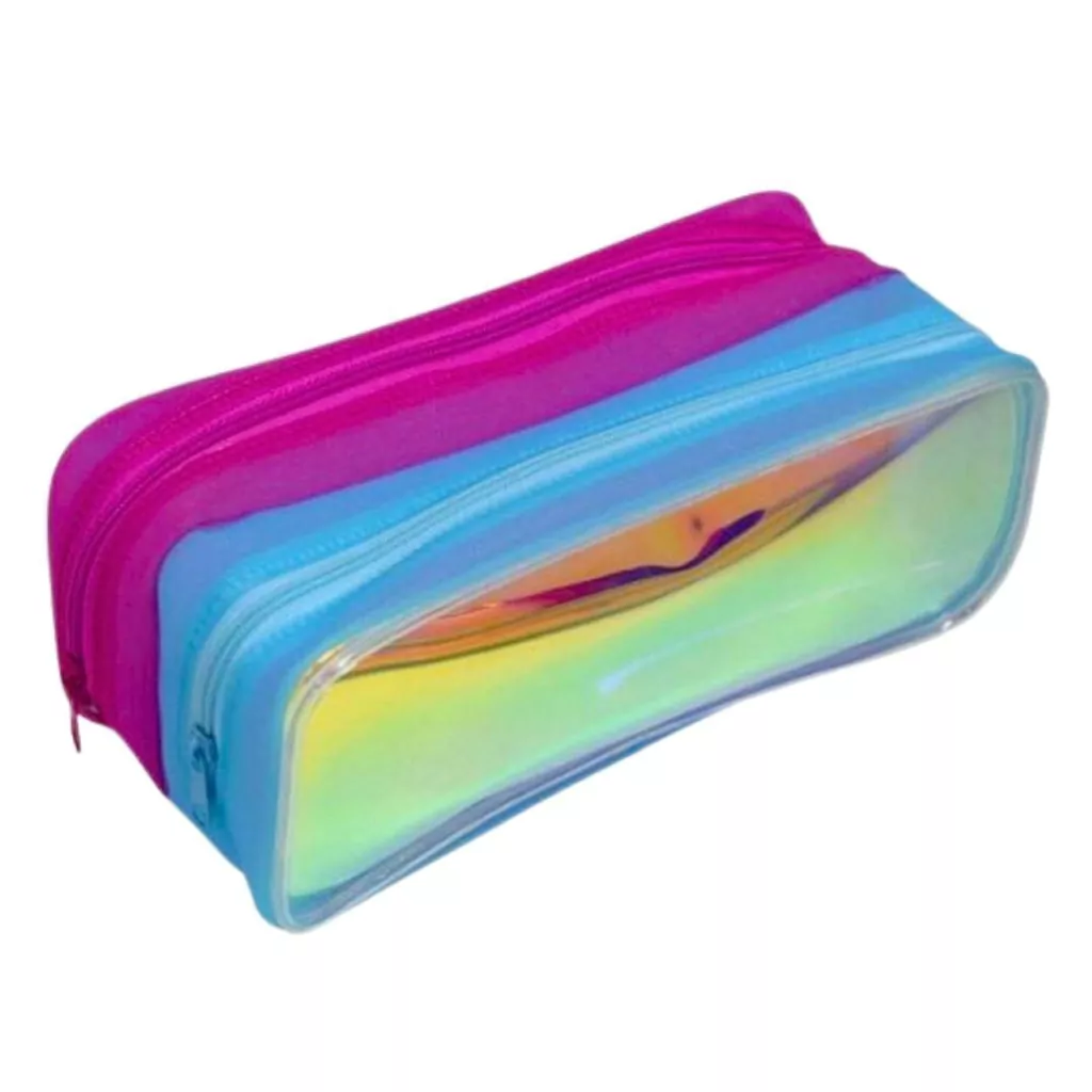 Com dimensões generosas de 205 mm x 80 mm x 95 mm, este estojo destaca-se por sua versatilidade. O material resistente e o efeito holográfico de alta qualidade conferem um toque moderno, enquanto o fechamento em zíper garante durabilidade e proteção aos seus pertences.