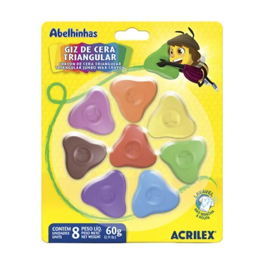 O Giz de Cera Triangular Acrilex - 8 Cores é perfeito para crianças a partir de 3 anos, sendo ideal para atividades na pré-escola e projetos escolares. Com um design triangular, ele oferece conforto sem restrições e facilita o uso, ajudando os pequenos a criar traços suaves e cores vibrantes.