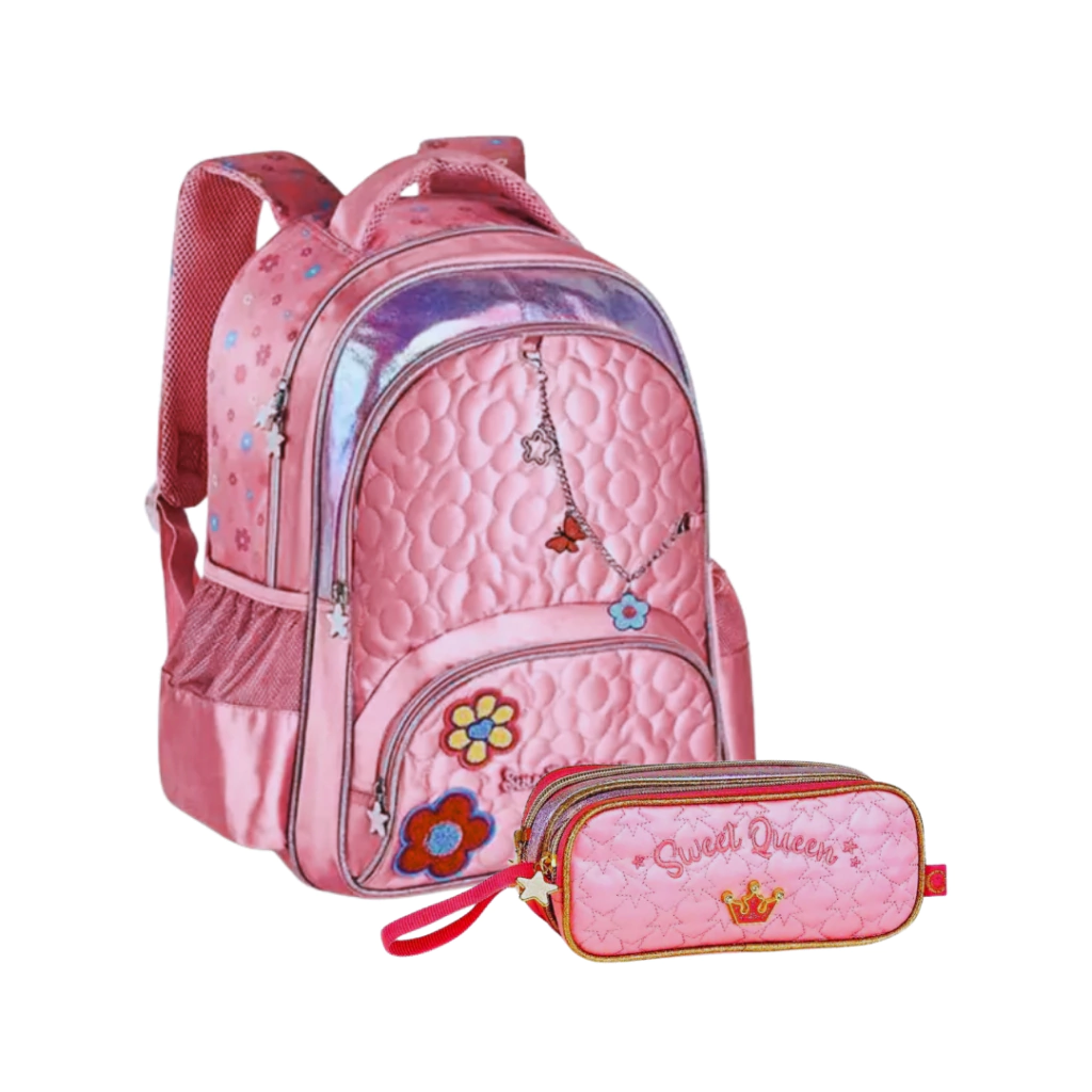 - Mochila Escolar Sweet Queen Flower – Clio: espaçosa, resistente e com design floral encantador.
