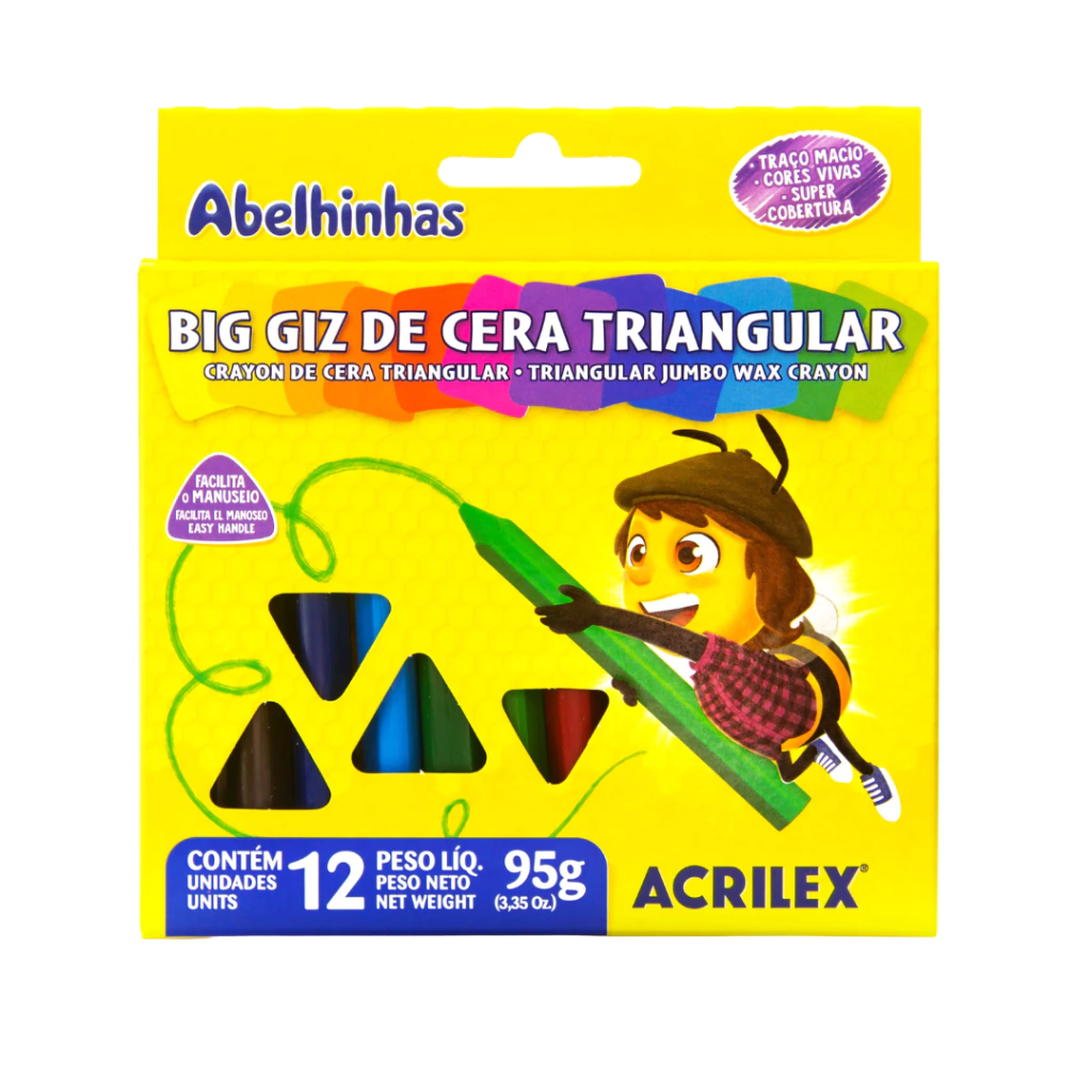 - 1 Giz de Cera Acrilex com 12 cores: formato anatômico, ideal para mãos pequenas, não suja e desliza com leveza.