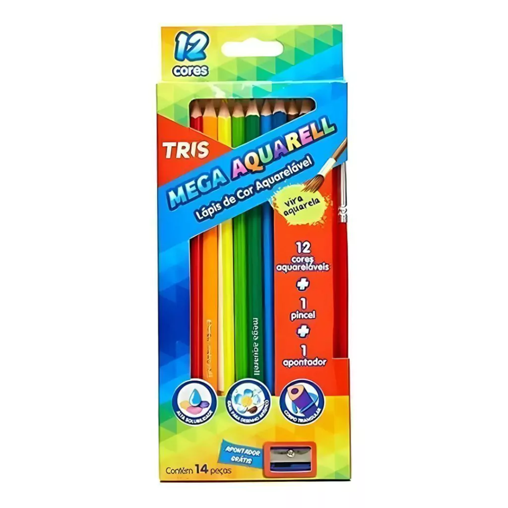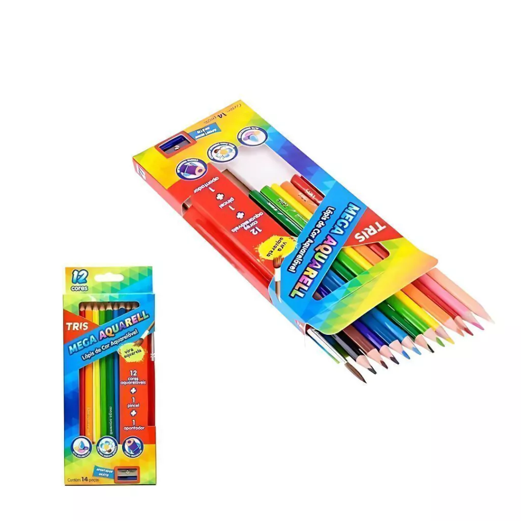 Transforme seus desenhos em verdadeiras obras de arte com o Tris Mega Aquarell! Um kit completo com 12 lápis de cor aquareláveis, pincel e apontador, perfeito para soltar a criatividade em ilustrações mais expressivas e cheias de vida.