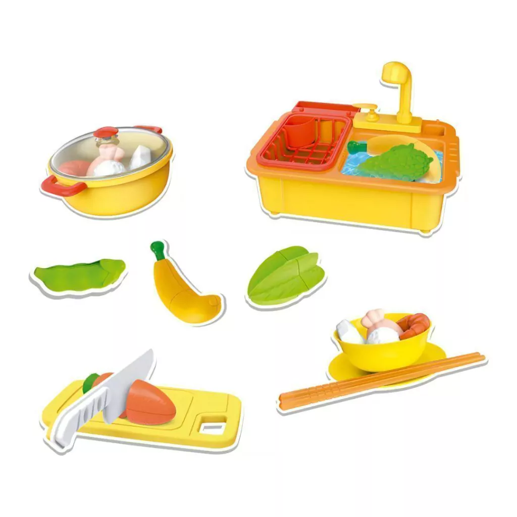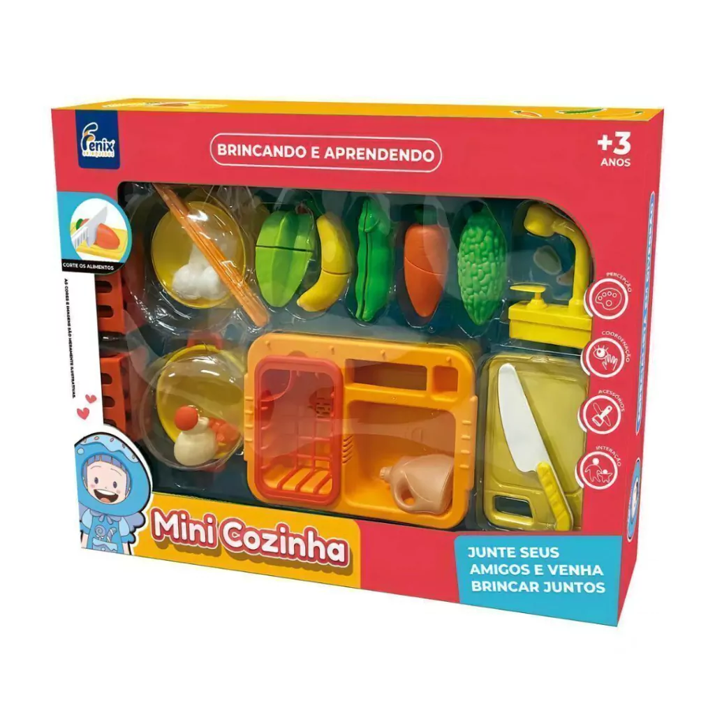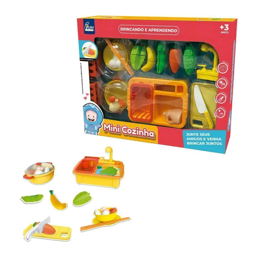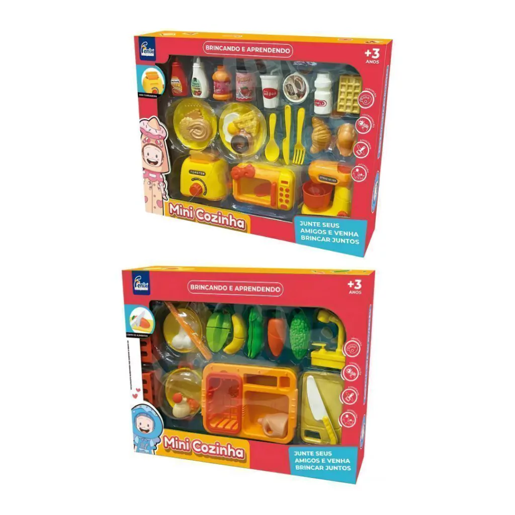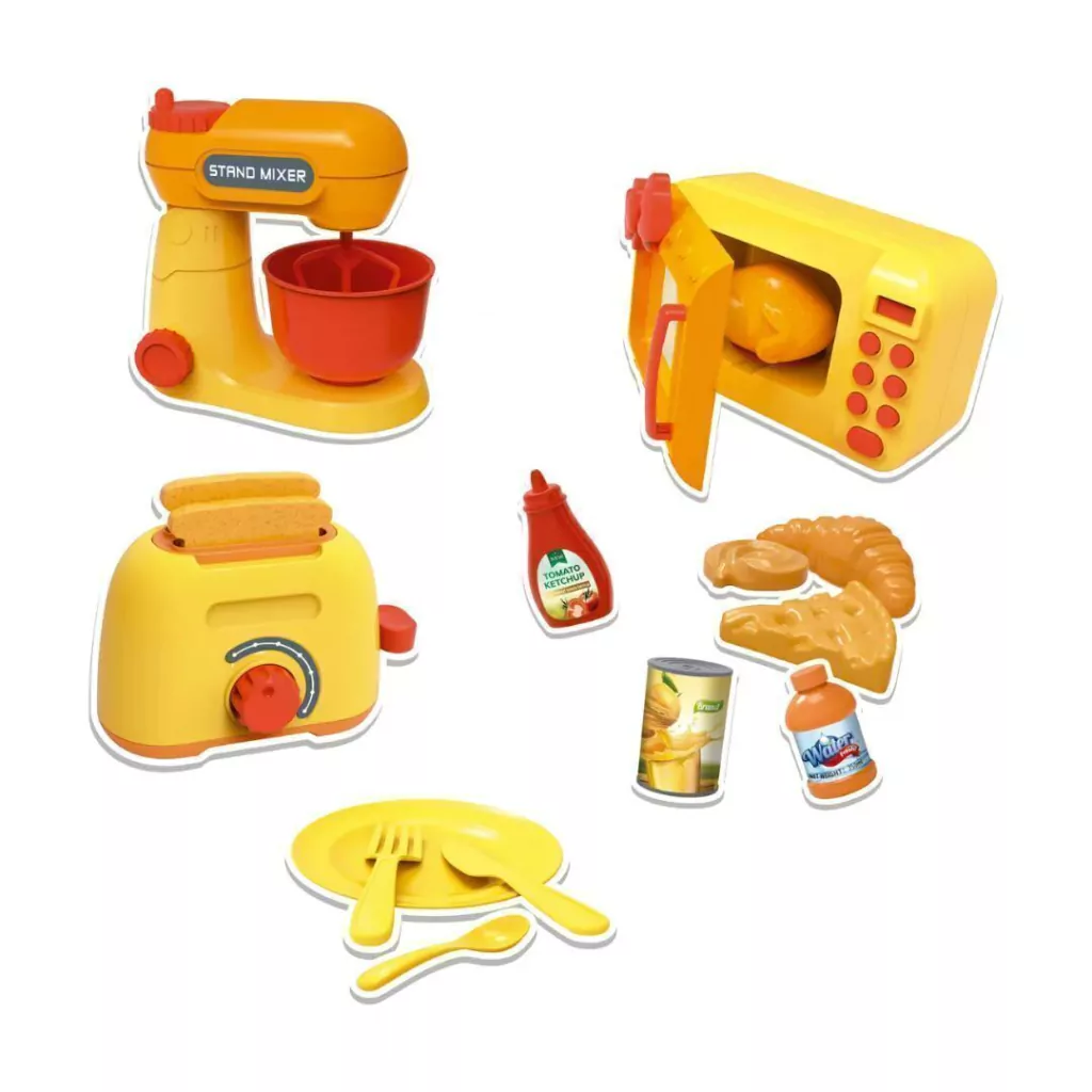2. Este conjunto encantador inclui um micro-ondas (12,5 x 7cm), batedeira (9,5 x 10cm), torradeira (11 x 8cm) e dois pratos (10cm). Adicionalmente, vem com talheres, frascos, galão de água, lata de suco, copo com canudo, e itens como bolachas, ovo frito e mais, todos com detalhes realistas.