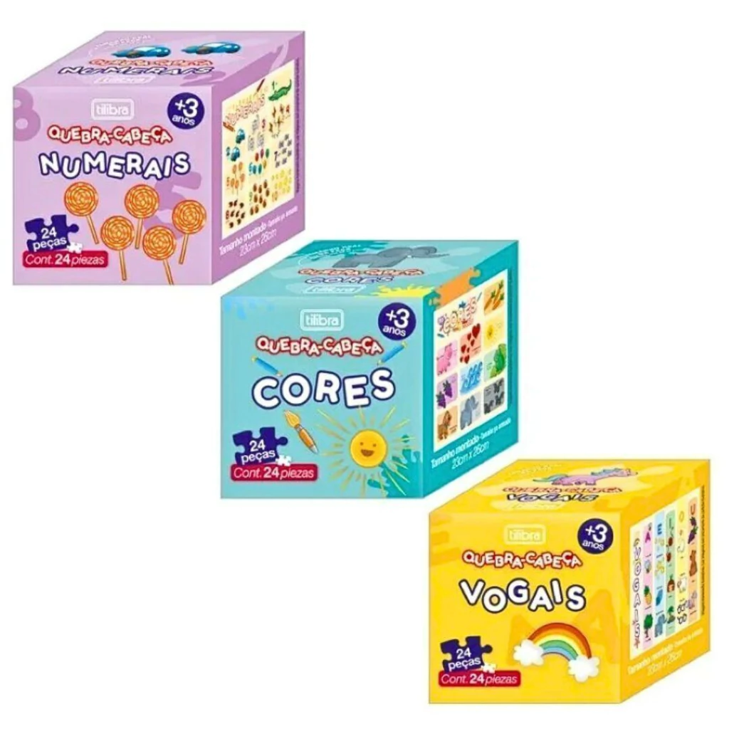 O Quebra-Cabeça Pedagógico tem 24 peças, com opções de temáticas infantis de Cores, Vogais e Numerais.